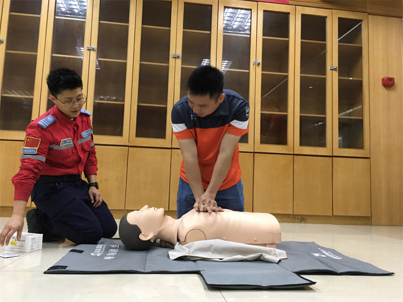 在交付仪式上,应急志愿服务专业人员为朱周胜进行了一对一的急救知识培训,让其快速进入状态,掌握心肺复苏术及AED设备操作方法?!按饲耙丫泄淮闻嘌?,两轮对比,发现他之前存在的(心肺复苏术)按压频次、力度不够的问题已基本解决,急救中对病患(人偶)观察不够仔细的情况,经过提醒已有明显转变。出手救人应该没有问题了。”培训师说道。