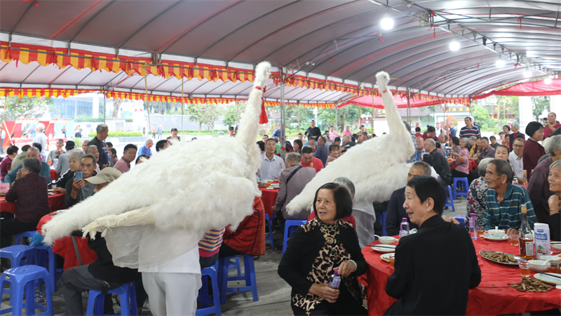 当天下午,一场温馨的“敬老宴”在鱼月村村委会的组织下率先开席,宴请全村60周岁以上的长者。宴席间,国家级非遗三灶鹤舞与市级非遗三灶狮舞轮番登场,为老人们送上吉祥祝福。现场欢声不断、情意融融,传递出浓浓的尊老敬老之风。
