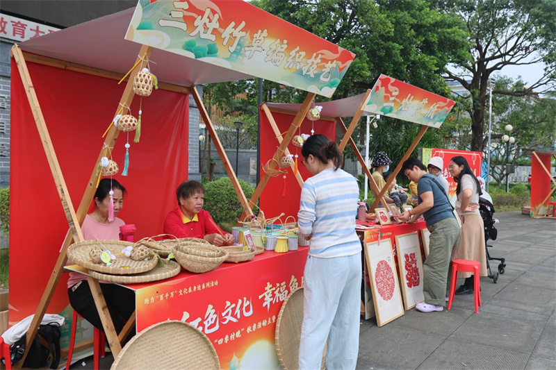 与此同时,广场一侧的非遗集市也吸引了不少村民驻足。定家湾茶果、三灶剪纸、竹草编织、古法蚝油、糖画等非遗项目一一亮相,村民在“赏、吃、玩”中感受传统文化的魅力。