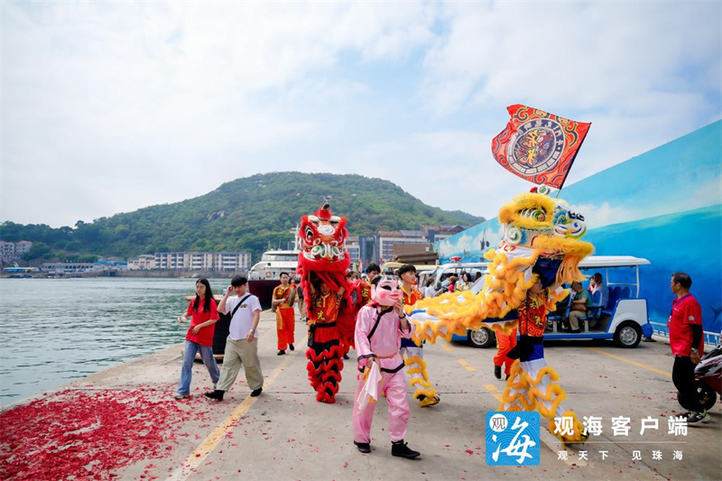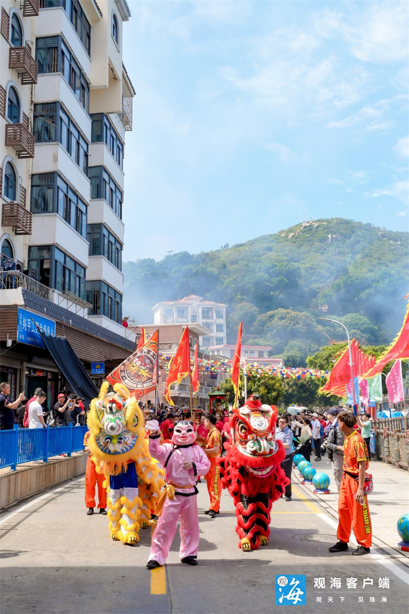 当天清晨,大万山岛渔港在激昂的锣鼓声中苏醒。醒狮队伍锣鼓开道,13位抬轿人抬着“妈祖金身”开始环岛巡游,浩浩荡荡的巡游队伍沿着海岛街巷前行。一路上,彩旗飘舞,热闹非凡,满满的祝福随着巡游队伍传递到家家户户,祝愿风调雨顺、渔获满仓、国泰民安。