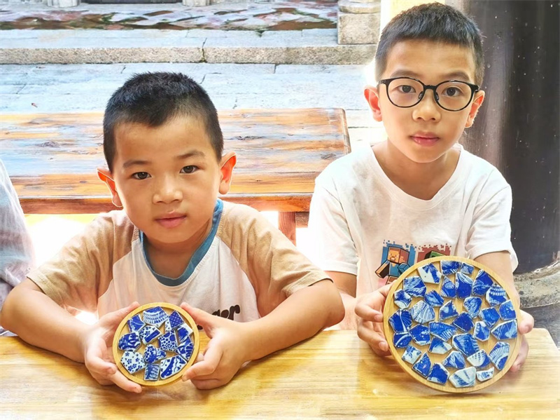 一块块素白瓷片,如同等待被唤醒的历史密码;一缕缕青花纹理,仿佛能够穿越时空的蓝色旋律?;疃胱盍钋鬃用瞧诖那嗷ù杀娲醋骰方?。在老师的悉心指导下,亲子们一步步以瓷为笔、创意为墨,在拼接、粘合中将千年瓷韵融入方寸之间。不一会儿,独一无二的青花图案在杯垫里慢慢成形,有的描绘着缠枝莲的婉转,有的勾勒着山水亭台的雅致,还有的展现着鱼藻纹的灵动?!懊幌氲讲腥钡那嗷ù善部梢宰龀稣饷疵赖幕?!我要一定要把青花瓷这项非遗带回家?!币晃恍∨笥迅咝说嘏跗鹱龊玫那嗷ù杀嫦蚰盖渍故镜?。