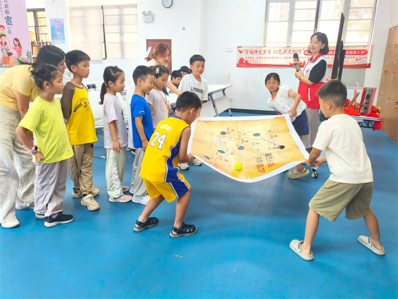 经过红色情景剧的精神洗礼,亲子家庭迎来了“重走长征路”团队协作挑战。孩子们需要紧密配合,通过默契协作不断调整巨幅画布的倾斜度,共同引导象征红军的小球,依次经过瑞金出发、血战湘江、遵义会议、四渡赤水、飞夺泸定桥等长征关键节点,最终胜利抵达延安。
