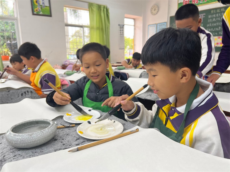 活动设置声乐、古典舞、国画、漆扇、陶艺、皮影戏等特色课程,覆盖了白蕉镇竹洲小学全校三至六年级共141名学生。其中,国画项目备受关注,师生们围绕竹洲小学的竹文化,以竹子和麻雀为创作主题,一方精心勾勒竹子的挺拔姿态,一方细致描绘麻雀的灵动模样,默契配合下,共同完成了一幅精美的国画卷轴。此外,孩子们在老师的带领下,沉浸式体验国画笔墨、漆艺匠心、陶艺拉胚、皮影戏光影等非遗技艺与传统文化,于创作中专注探索,不仅收获了技能,更在心底萌发了对非遗和本土传统文化的热爱,让优秀传统文化的种子得以在少年儿童心中扎根。