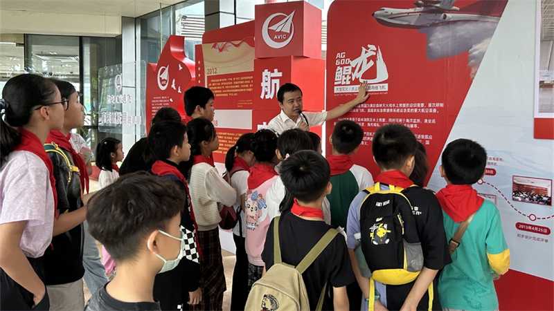 活动伊始,少先队员们怀着激动与好奇的心情,来到AG600飞机总装生产线。讲解员介绍,AG600飞机是我国为满足森林灭火和水上救援的迫切需要,自主立项研制的大型特种用途民用飞机?!八?0秒内能汲水12吨!”五年级队员小林兴奋地记录着数据。当得知AG600从设计到零部件全部实现国产化时,孩子们纷纷竖起大拇指:“中国制造太厉害了!”此外,队员们还了解了我国自主研制的大型水陆两栖飞机的研制历程。