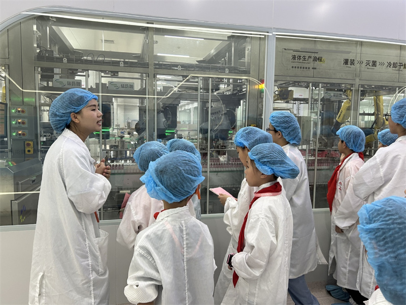 随后,队员们来到了汤臣倍健透明工厂,智能化生产线上的机械臂灵活翻转、激光导航运输车有序穿梭……队员们直呼“曾经的科幻片成真了”。透过玻璃,孩子们看到原料经过层层筛选、精密配比,再到压片成型、包装检测等全过程。这种全透明的生产模式,让队员们对“中国制造”的品质有了更深刻的印象。