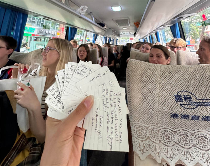 10月21日下午,在前往高铁站的巴士上,美国欢庆艺术舞蹈团团长贺家丽(Laurie Haupt)将一叠手写纸条交到珠海市文联工作人员手中。纸页间,是21位美国高中生用真诚写就的珠海记忆。