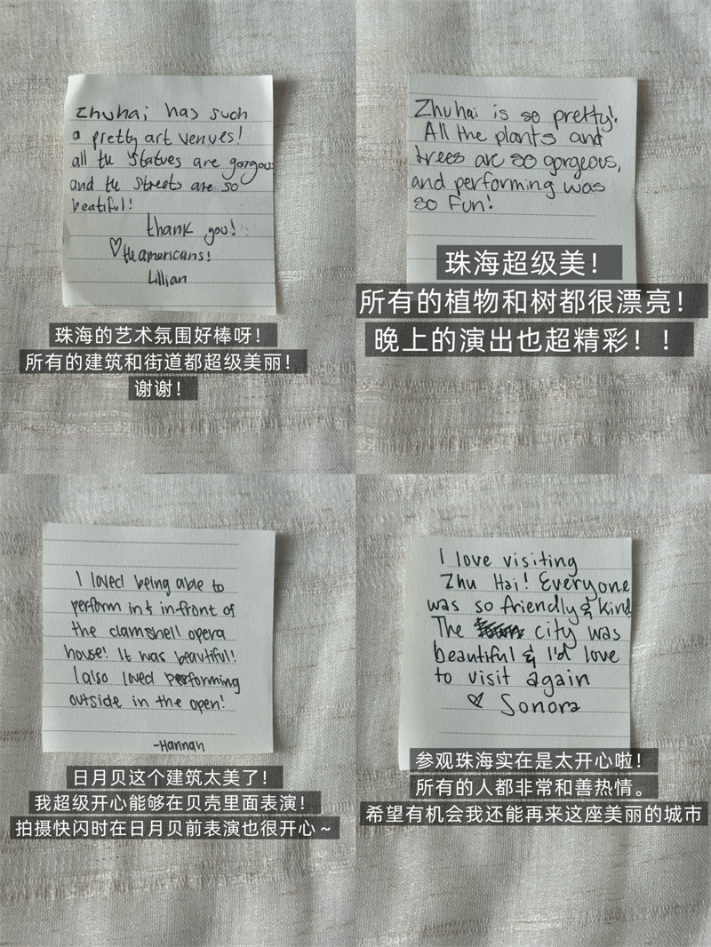 如今,舞团已抵达长沙,继续他们的中国之行。那些写在纸条上的真挚话语,那些在日月贝舞台上的翩跹身影,还有中美青少年之间建立的友谊,都已在这个金秋时节,成为珠海一道温暖的文化交流印记。(来源:观海融媒)